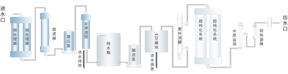 采用多級(jí)預(yù)處理器過(guò)濾,雙膜法及雙級(jí)反滲透工藝,進(jìn)口陶氏反滲透膜片,配備EDI電除鹽膜塊,更深層次去除水中離子,